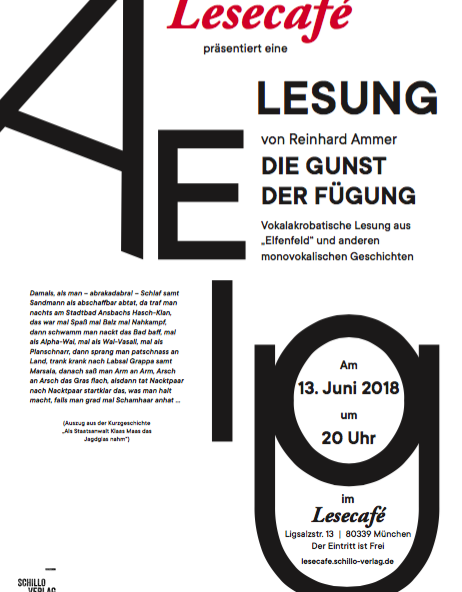Am kommenden Mittwoch, den 13.06.18, wird unser geschätzter Freund und Autor Reinhard Ammer eine seiner sehr sehen- und hörenswerten vokalakrobatischen Lesungen abhalten. Um 19.00 Uhr öffnet das Lesecafé seine Pforten, um 20.00…